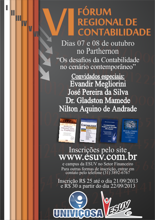 O VI Fórum Regional de Contabilidade será realizado nos dias 07 e 08 de Outubro 2013, Cerimonial Parthenon: Rua Antônio Lopes Lelis, 199 - Bairro Santo Antônio, sob a Coordenação dos alunos do 6º período de Ciências Contábeis.